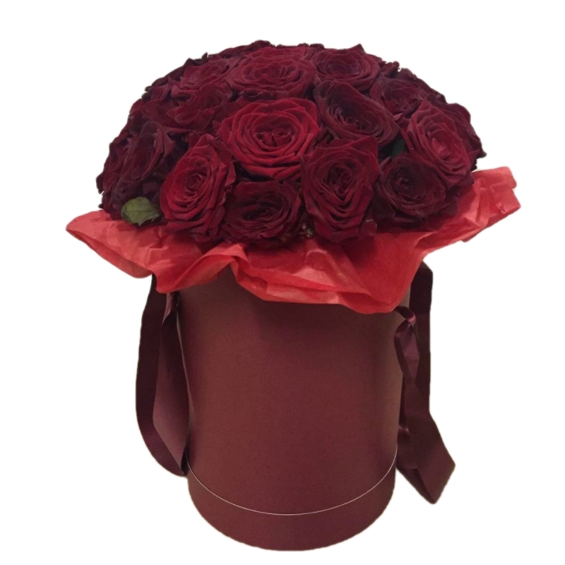 Букет состоит из 25 бордовых роз, коробка, бумага тишью, оазис.