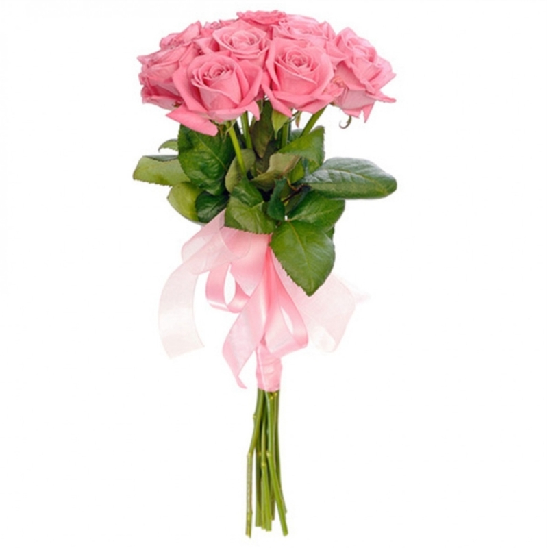 Букет состоит из 7 розовых роз, прозрачная упаковка, атласная лента.