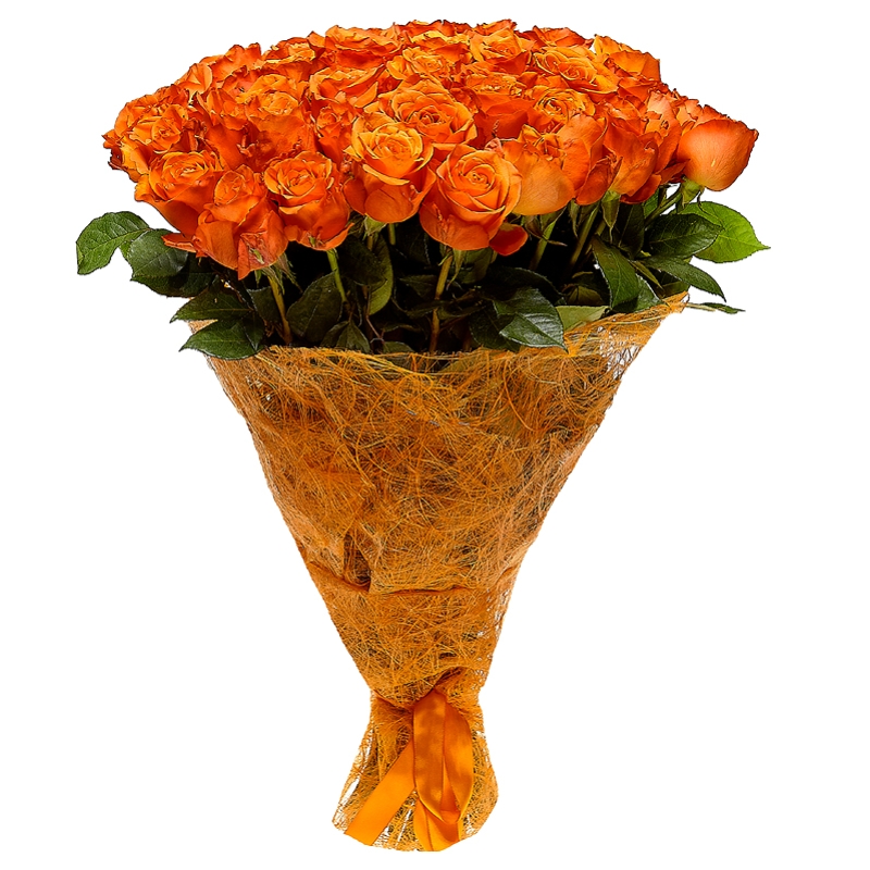 Букет состоит из 45 оранжевых роз, красивая упаковка, атласная лента.
